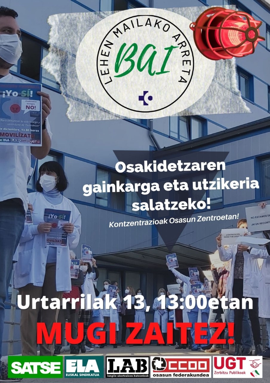 Osakidetzako kolapsun aurrin, Kalitatezko zerbitzu pubikuai BAI! lelopin batuko gaz anbulatoxo aurrin ongoxe eguenin (U-13) eguerdiko ordu batetan. Osakidetzako langillin lan kargi eziñezku bihurtu de ta holaik ezin leike kalitatezko osasunik euki.