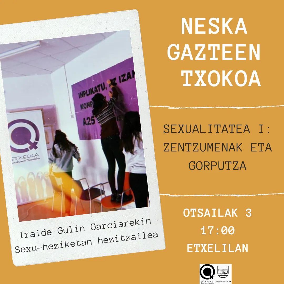 Datorren astean hasiko da NESKA GAZTIN TXOKU martxan! Sexualitatiai buruzko lelengoko bloki eukiko dou, Iraide Gulin Garciak gidatute. Zentzumenetatik eta gorputzetik. Gogoratu, Otsailak 3 (eguena) arratsaldeko 5 etan Etxelilan.