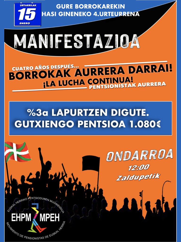 “2022ko urtarrilan 15in, zapatun, lau urte beteko diz Hego Euskal Herriko Pentsiodunen Mugimenduk mobilizaziñoik hasi genduzenetik. Egindako mobilizaziñoin ondorixoz aldarrikatutako eskakizun batzuk lortu diz, bañe ez guztik. Borroka luze horren 4. urteurrena gogoratzeko Zaldupetik 12:00xetan urtengo daben manifestaziñoi eingo dou; Lan Erreformin kontra eta aplikatu nahi doskun KPI mota barrixan aurkako aldarrikapenakin. Mobilizaziñoi horretan parte hartzea animaten zatxuau, bai pentsiodunak, baitxe be lan-aktibun zazenok”.