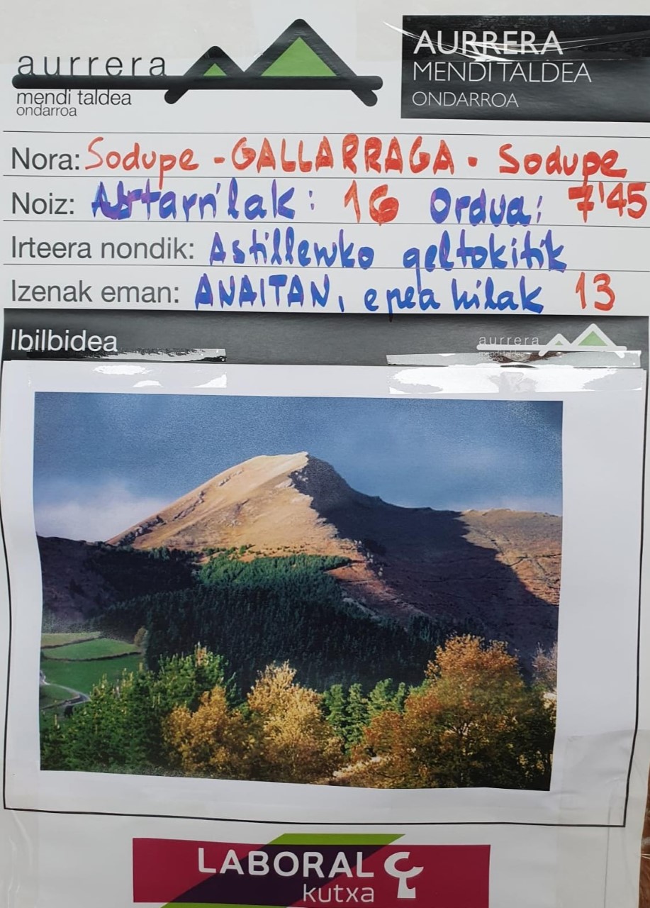 AURRERA MENDI TALDEkuk be urteko lelengoko irteeri antolatu dabe ongoxe domekako. GALLARRAGA mendixe (901 metro) Ganekogortako mendilerrun dan tontorra da, Araba eta Bizkaia artin kokatutaku. Animaten bazaze, ixena ANAITASUNA tabernan emon bikozue ta ixena emoteko azkan egune Urtarrillak 13 e (eguena) ixango da.