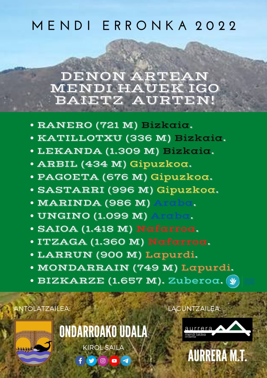 Ondarruko udalak AURRERA MENDI TALDIaz batea hauxe mendi erronki proposatuzku aurtengo urteako ta guk ezetz ez dakiauenetik esaten ba.. baietz ein! Guztire 13 mendiko zerrendi zabaldu dabe: hiru mendi Bizkaxan (RANERO, KATILLOTXU eta LEKANDA) beste hiru Gipuzkun (ARBIL, PAGOETA eta SASTARRI) bi Araban ( MARINDA ta UNGINO) bi Nafarrun ( SAIOA eta ITZAGA) bi Lapurdin ( LARRUN eta MONDARRAIN) eta bat Xiberun ( BIZKARZE).