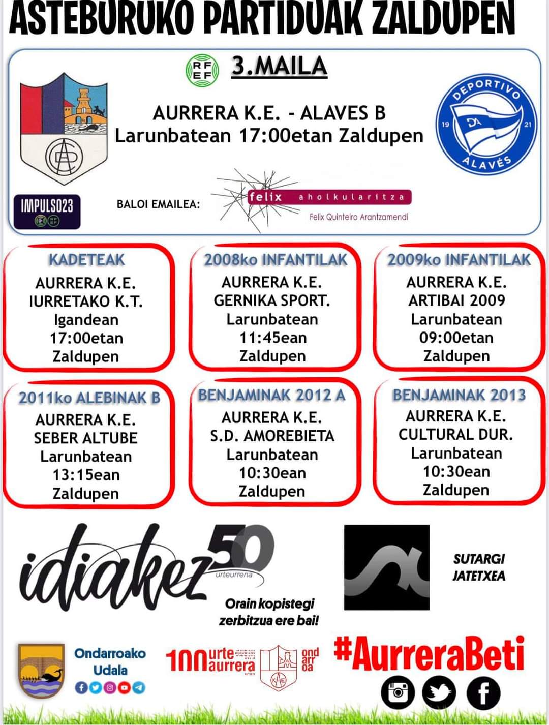 Asteburo honetan AURRERAko talde desbardiñak Zaldupe udal futbol zelaxan jokatuko dotxuen partidun egun eta ordutegixak diz azpixan ikusiko dozuenak.