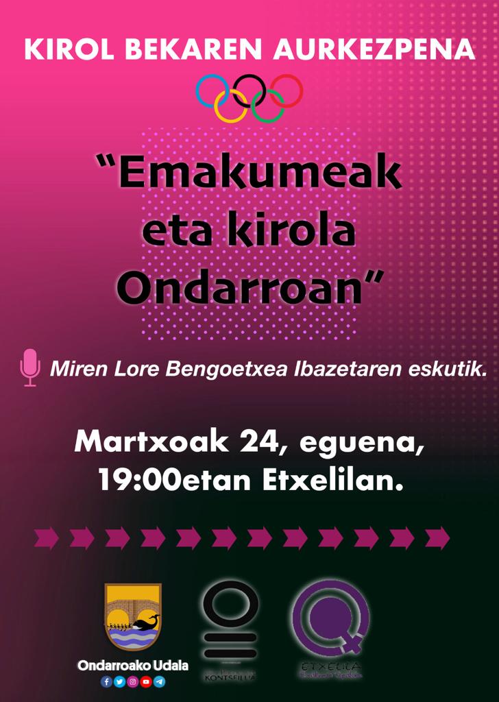 Ondarruko udalan kirol sailak esleitutako ” Emakumik eta kirola Ondarrun” bekin aurkezpena eingo dau Miren Lore Bengoetxea Ibazeta kazetari ondarrutarrak ongoxe eguenin arratsaldeko 7 retan Etxelilan.