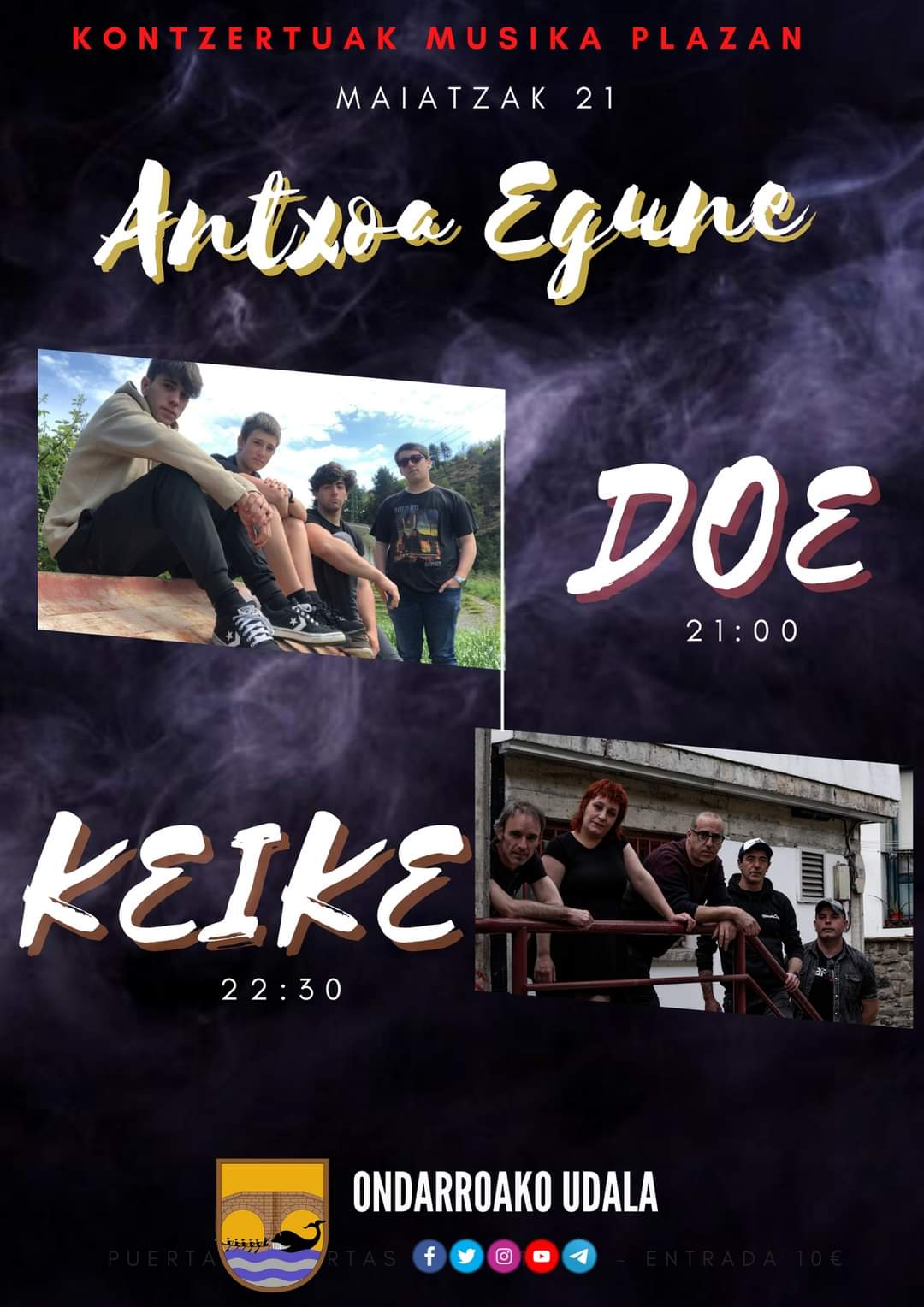 Udala hasitxe da Antxoa eguneko egitarau prestaten, eta gabeako kontzertu honek antolatutxu. Herriko bi talde eukikouz Musika Plazan egune girotzen, DOE eta KEIKE.
