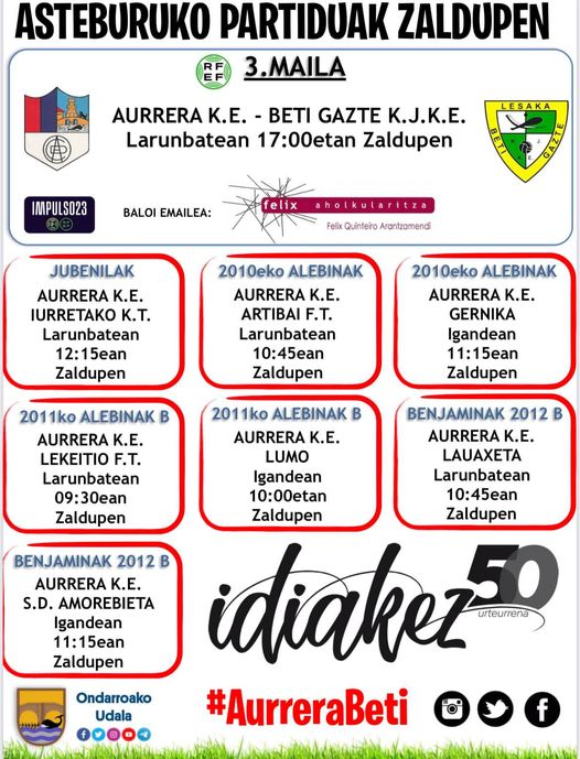 Honek diz astebukaera honetan AURRERAko talde desberdiñak Zaldupe udal futbol zelaxan jokatuko dotxuen partidun egun eta ordutegixak.