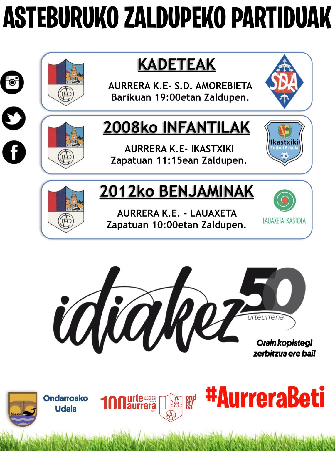 Honek diz asteburu honetan AURRERA futbol talde desbardiñak Zaldupe udal futbol zelaxan jokatuko dotxuen partidun egun eta ordutegixak. AURRERAko zuzendaritzik be gogoratzen dosku, Jubenilak mallaz altzateko aukeri daukela zapatun eta partidu horren atsedenaldixan liga irabazi daben harrobiko taldik omenduko dabela. Aupa AURRERA tra ka tra!
