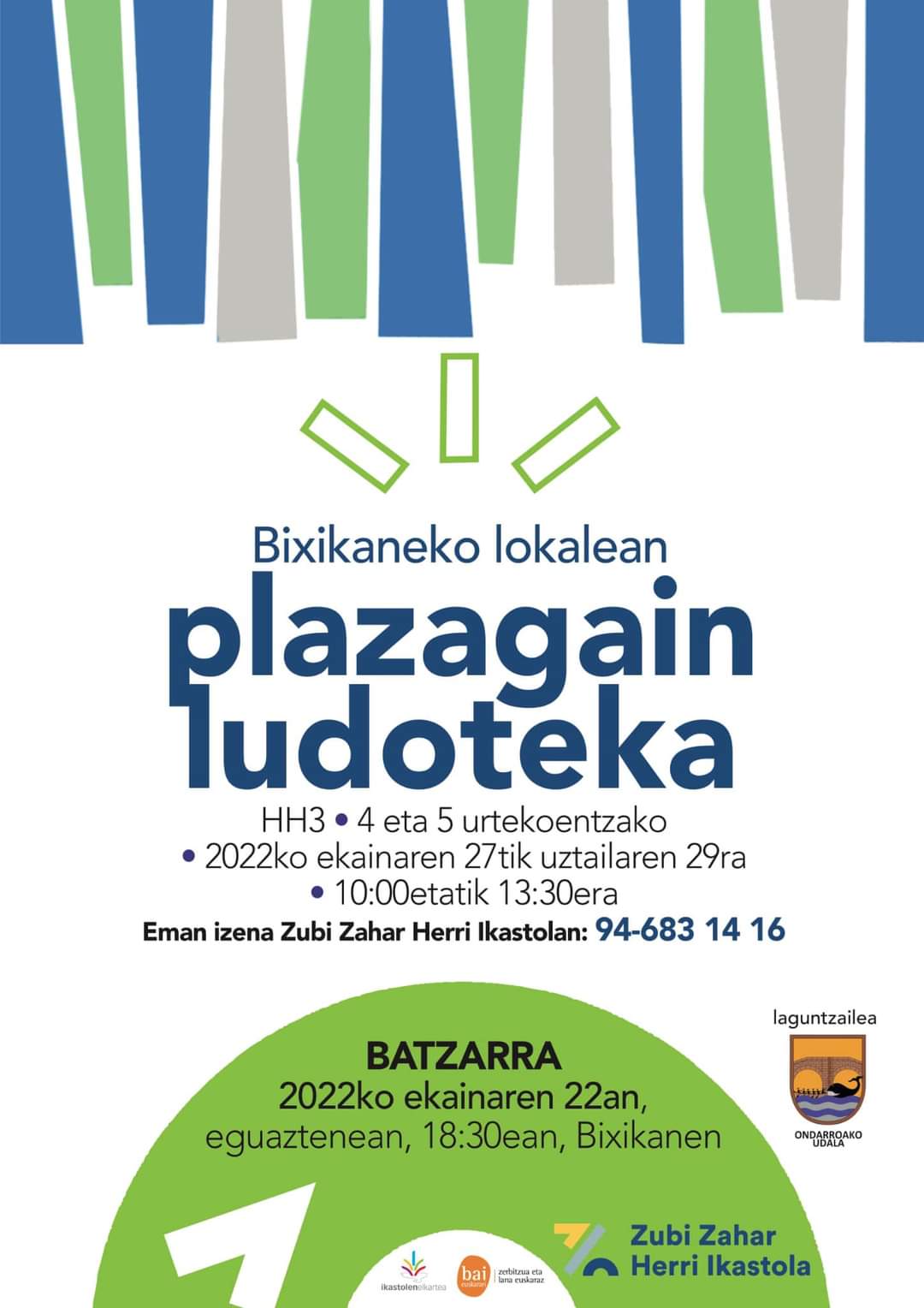 Ekainan 27 txik uztailan 29 bittartin eongo da zabalik ludoteki Bixikaneko lokalin goxetan 10 etatik eguerdiko 13:30 ta, HH3- 4 eta 5 urtekuntzako. Interesa badakazue, deitu Zubi-Zahar ikastolako telefono zenbakire (azpixan dakazue). Batzar bat eingo da ekainan 22an (eguaztena) arratsaldeko 6:30 tan Bixikaneko lokalin.