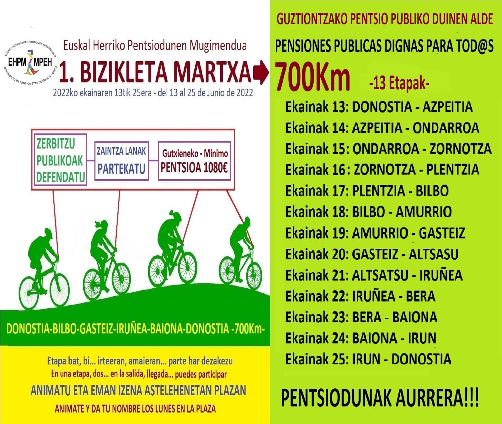 Arrazoi horrekatxik, Euskal Herriko Pentsiodunen Mugimenduk arazo horrei erantzuteko eta mobilizatzeko hainbat kanpainatan konprometitute gaz. Bañe, bereziki, Pentsiodun Bizikleta Martxa bat antolatzea animatu gaz, Donostin hasi eta amatxuko dana, eta etapa batzutan, ekainan 13tik 25ea, Euskal Herri osu zeharkatuko dabena.