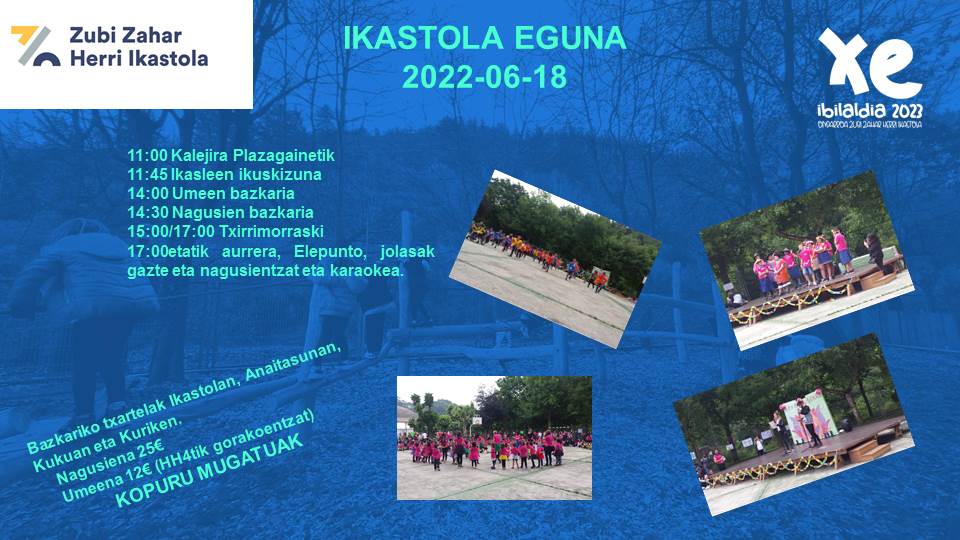 Bi urte geldik egon ondoren, ekainan 18 (zapatun) ospatuko dabe osteabe Zubi-Zaharrekuk, ikastola egune. Bazkaire juteko txartelak Anaitasuna, Kukuan eta Kuriken egongo diz salgai. Egunin tzir jolasak, karaoki…dantzan eta kantun etxeko atxikirik baiko egune.