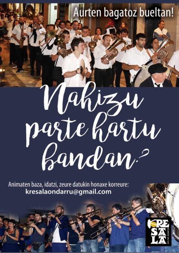 Herriko musikero guztiai zuzendutako galderi de hau. Aurten bagatoz bueltan! esanaz eta animaten dizen guztiai behian ikusiko dozuen korreo elektronikure zuzentzeko eskaeri eiñaz zabaldu dabe albisti KRESALA kultur elkartekuk. Ia kalin ikusi eta entzuten douzen laster! Anima!