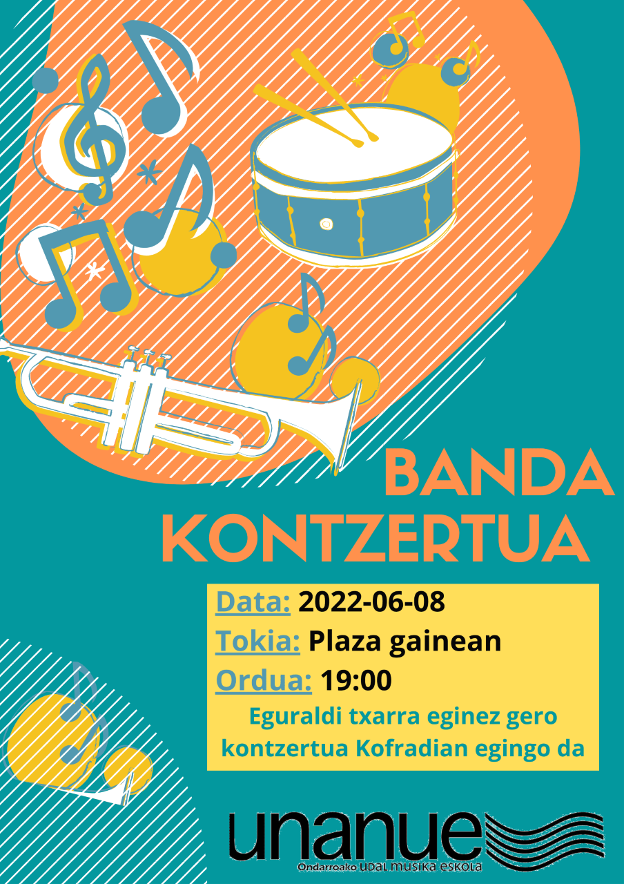 Musika zali bazaz, ta egueldixe lagun bada, Plazagañea hurreatu (eguraldi txarra bada Kofrai Zaharrin) ekainak 8 arratsaldeko 19:00 etan. Bertan Banda kontzertu entzuteko aukeri eukikozu Unanue udal musika eskolakuk antolatu daben emanaldixan.