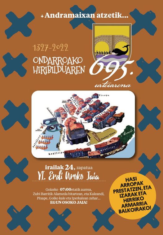 Andra Mari jaxak amatxu diz, bañe prest dakau hurrengo ekimena: ERDI AROKO JAXE irailak 24 an. Ondarruko herrixak 695. urte beteten dotxu herri latxeik (1327-2022) eta hori ospatu ein bihir dou, hasi erropak topaten, balkoik txukuntzeko izarak billatzen….Ondarrutarrok herrixaz harro gazelako, geuk dakiauen latxeik ospatu eingou!