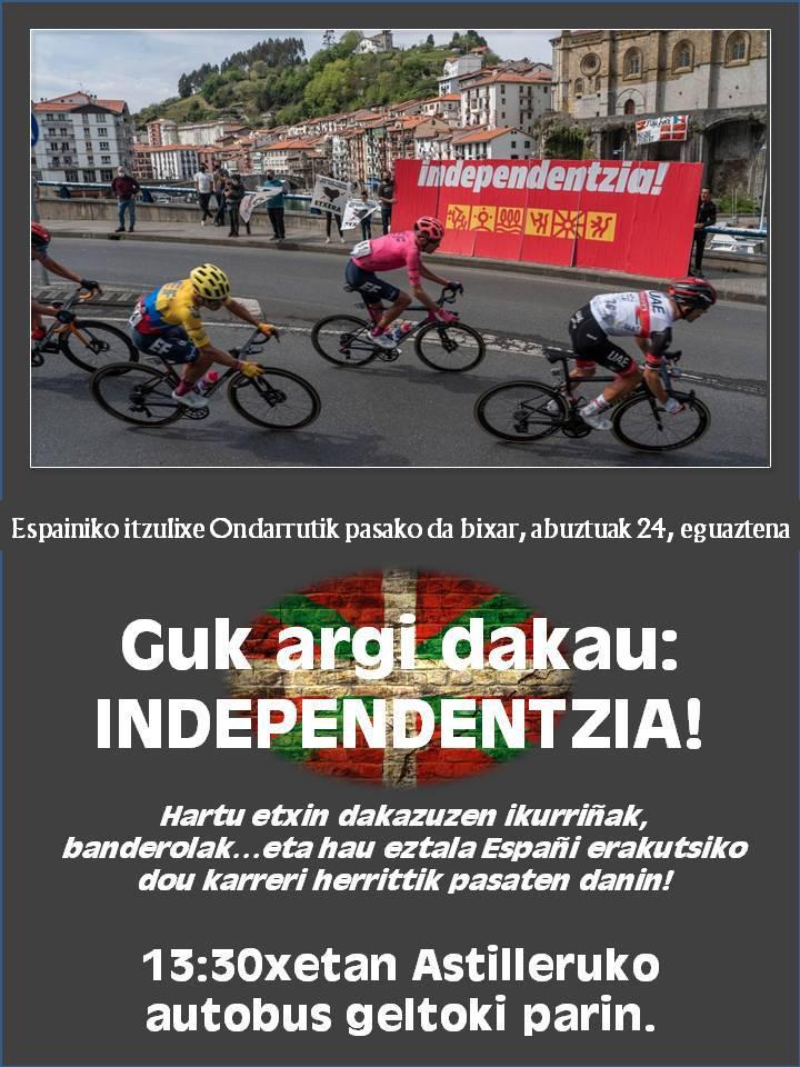 Bixar eguerdixan Españiko itzulixe (bizikleta karreri) gure herritxik pasako da ta hori dala ta 13:30 tan Astilleruko geltoki parin batzeko deixe eindabe. Etxin dakauzen ikurriñak, presun aldeko banderolak… dakazuena erun. Kirolzalik bagaz bañe GUK, ARGI DAKAU, GUK GEURE KOLORIK MATXE DOUZ! ONDARRU EZ DA ESPAÑI! eta karreri herritxik pasatzerakun hori aldarrikatukou!