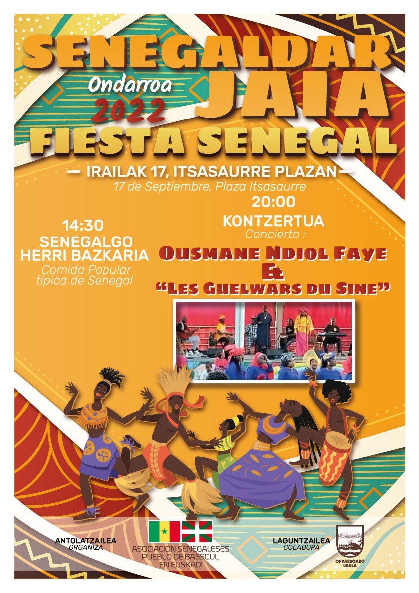 Irailan 17 xan Senegaldar jaxe ospatuko da Ondarrun, Itsasaurren plazan. Etxe barrun, ezker eskuma bixi gaz, asko gaz alkarreaz biharra etxen douenok, tallerretan, portun, itsosun… ta hain urrin eta hain aparte sentiuten gaz alda batea. Gure lankidik, Moussa , Lamin, Abdoulaye, Idrissa, Mamadou, Ousmane … deitzen diz, eureak esaten dabe gu zurixak eigaz eta eurak morenuk eidiz, bañe danok izerdi bardiñe botaten dou. Zeatxik ez dakiau alkarren barri? Irailak 17 xan, euran janaxak ezautzeko aukeri eukikou, zelako musiki gustoku daben, eurakin egoteko eta egun ederra pasateko hitzordu ixango da. Hurreatu zeuek be jaire!