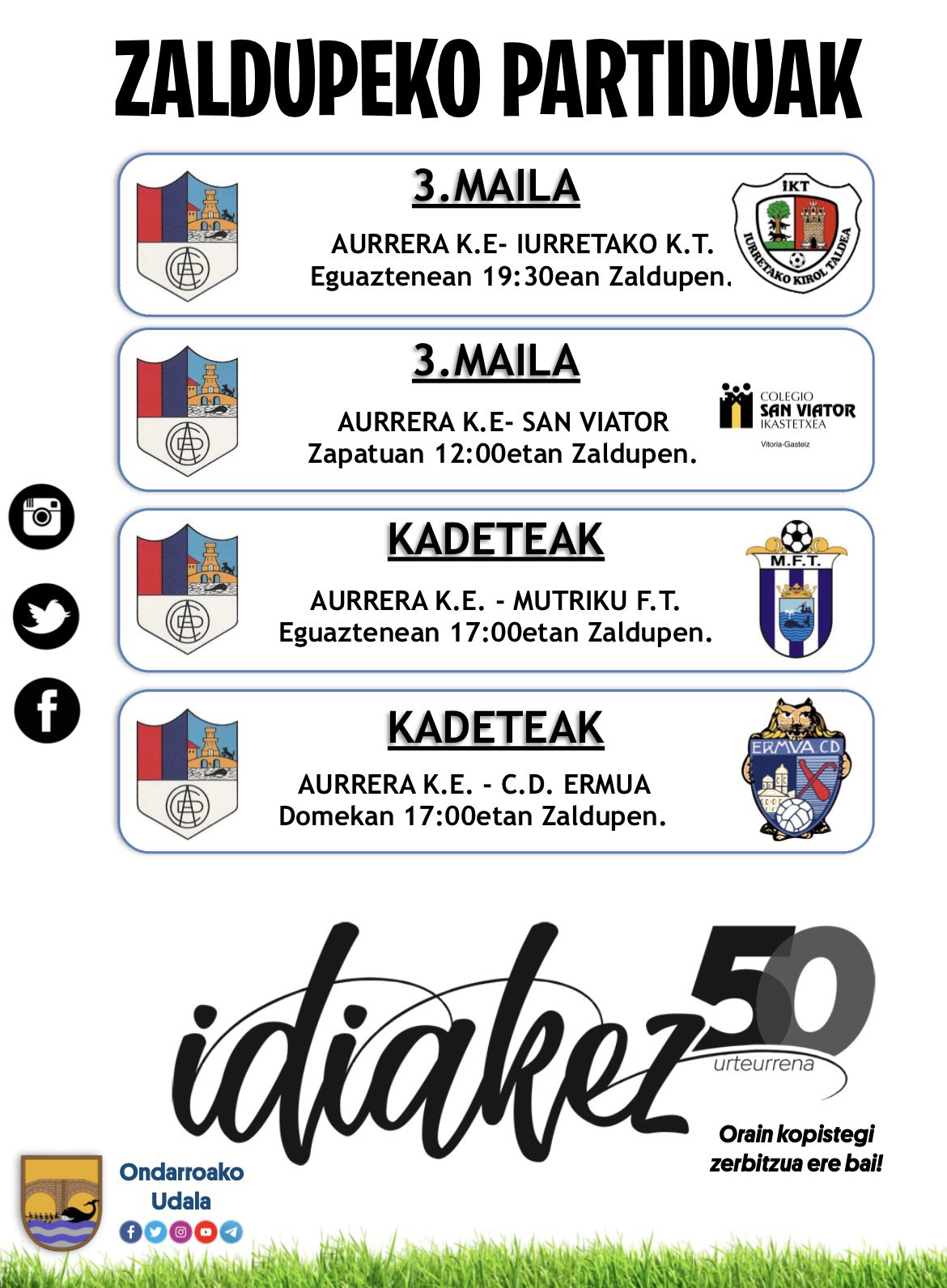 Zaldupe udal futbol zelaxan AURRERA K.E talde desberdiñak ongo astin jokatuko dotxuen partiduk diz beheko kartelin ikusiko dozuenak.