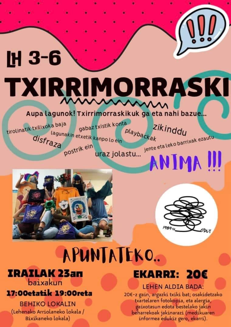 Txirrimorraskin ixena emoteko aukeri irailan 23an 2022/09/15turrune TXIRRIMORRASKI denbora libre taldin ixena emoteko aukeri da irailan 23an 17:00etatik 19:00eta lehenako Arriolaneko lokalin. Partekatu hau: Click to share on Facebook (Opens in new window) Facebook Click to share on X (Opens in new window) X Atsegin dut Kargatzen...