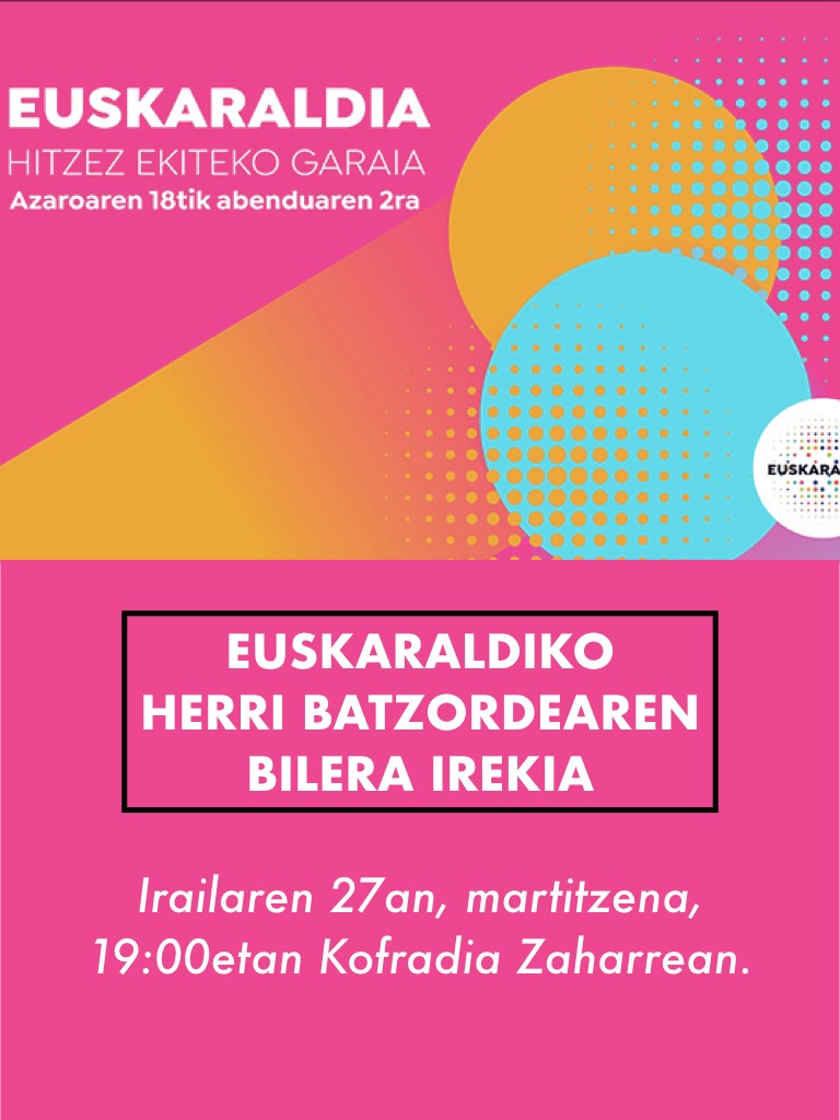 Euskaraldiko Ondarroako Herri BatzordIk billera iraixe antolatu dau herriko norbanako zein eragilitako ordezkarixantzat: Irailan 27 xan, martitzena, 19:00etan Kofradia Zaharrin. Gogoratu aurtengo EUSKARALDIXE Azarun 18 txik Abendun 2 re ixango dala, prest zaze Belarriprest edo Ahobizi ixateko? GU BAI!