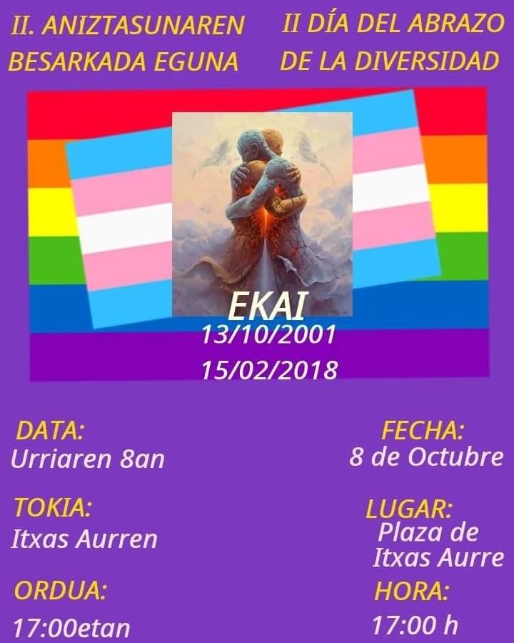 Urriak 8 xan, II. Aniztasunan Besarkada egune ospatuko da herrixan, EKAIren urtebetetzi ospatzeko. Bertsuk eongo diz, agurre dantzatuko dabe, batukadiaz dantzatuko dou, besarkadak elkarbanatuko diz eta besarkada kolektibo bateaz amatxuko da, mundu geldiaraziko dabena, edo behintzat denbori. Hurreatu Itsasaurreko plaza arratsaldeko 5 etan ongo zapatun!