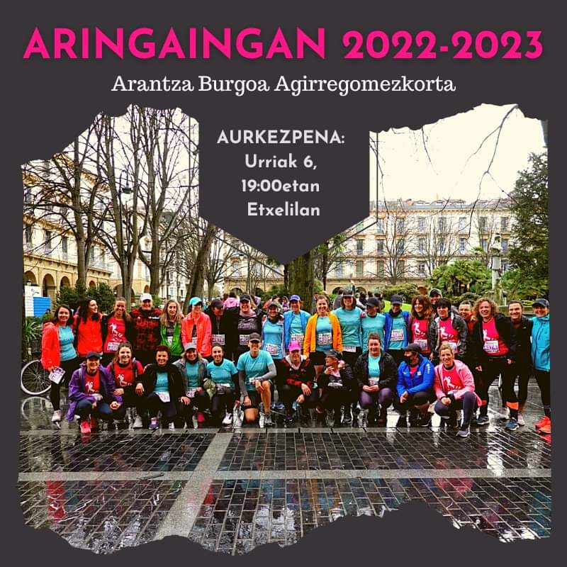 Aringaingani buruz: Gero eta gexaua gaz norberan gorputzan eta mugimendun kontzientzixi hartute jarduera fisikuaz gozatzen douen emakumiok. Kalin beldur eta lotsa guztik gainditu eta gustoa jarduteko helburuaz jarduten gaz topagunin, partaidin arteko harremanak sustatuz eta alkarreaz espazixo publiku irtetea bultzatuz. Heziketa Fisikun lizentziatu dan emakume baten dinamizaziñoin bidez, norberan gaitasunen araberako entrenamendu pautak eskaintzen diz, erritmo desberdinetan aurrea etxeko (mailan araberako taldik osatuko diz). Urtero latxeik, helburu ixango da alkarreaz Lilatoin edota bestelako lasterketetan parte hartzi.