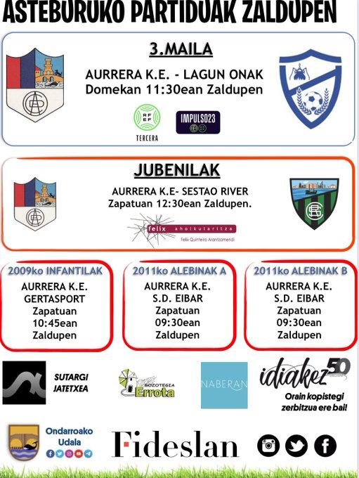 Honek diz asteburu honetan AURRERAko talde desberdiñak Zaldupe udal futbol zelaxan jokatuko dotxuen partidun orduk eta egunak.