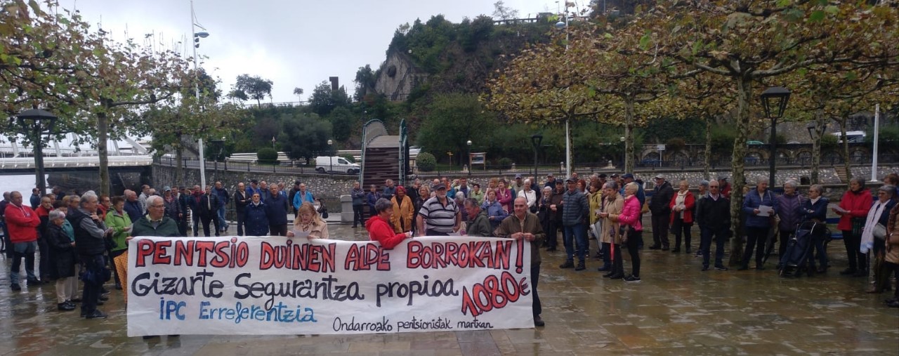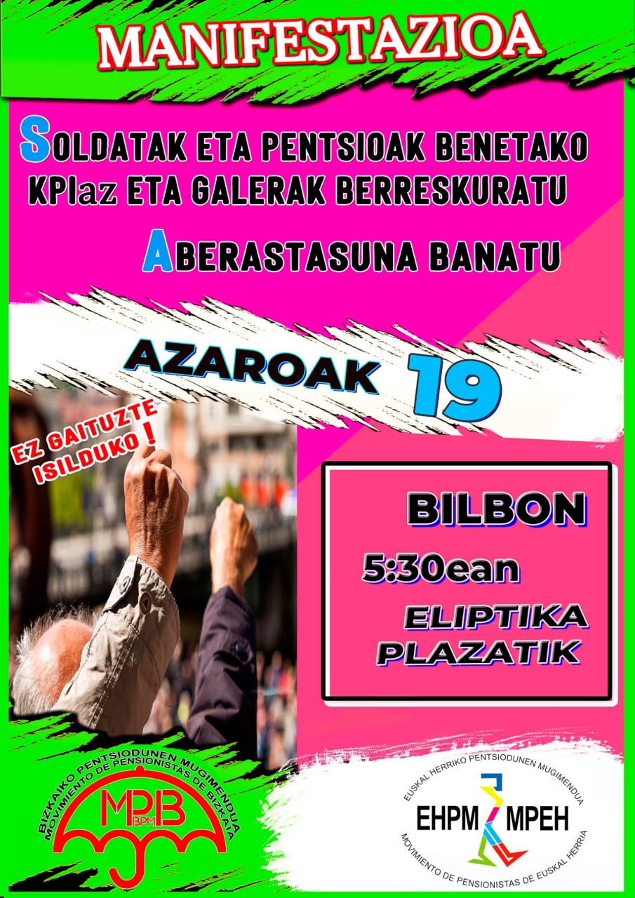 Gaur osteabe Alamedan batu diz herriko PENTSIONISTAK. 12 xak puntun batu diz pankarta atzin 130 lagun antolakuntzakun esanetan. 20 minutu egon diz bertan eta besteak beste dei berezi bat eindabe zapatun (A-19) Bilbon eingo dan manifa juteko, SOLDATAK eta PENTSIÑOIK benetako KPIaz eta galerak Berreskuratuaz ABERASTASUNA BANATU! eskatzen. Manifestaziñoiko deitzalli, BIZKAIKO PENTSIONISTAN MUGIMENDU de.