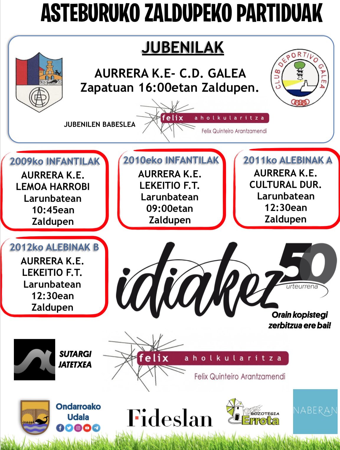 Honek diz asteburu honetan Zaldupe udal futbol zelaxan AURRERAko talde desberdiñak jokatukotxuen partidun egun eta ordutegixak.