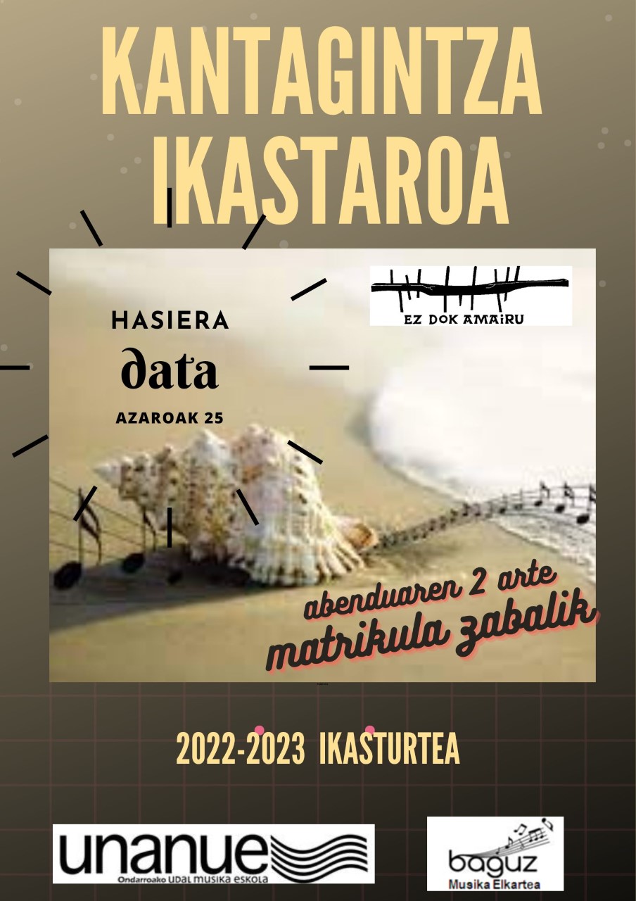 Zeozer matxe badou Ondarrutarrok, kantati de. Lotsi etxin laga eta lagun artin alkarreaz kantati gustoku bazu, UNANUE udal musika eskolik urtero antolaten daben Kantagintza ikastarun parte hartzeko aukeri emotezku. Azaroak 25 etik Abendun 2 bittartin matrikulateko epi zabalduko dabe. Anima!