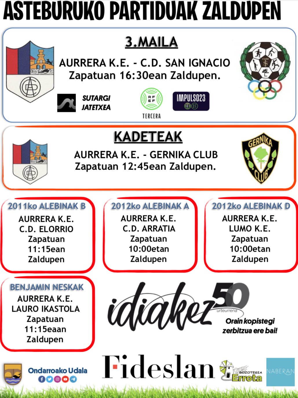 Honek diz astebukaera honetan Zaldupe udal futbol zelaxan AURRERAko talde desbardiñak jokatuko dotxuen partidun egun eta ordutegixak.