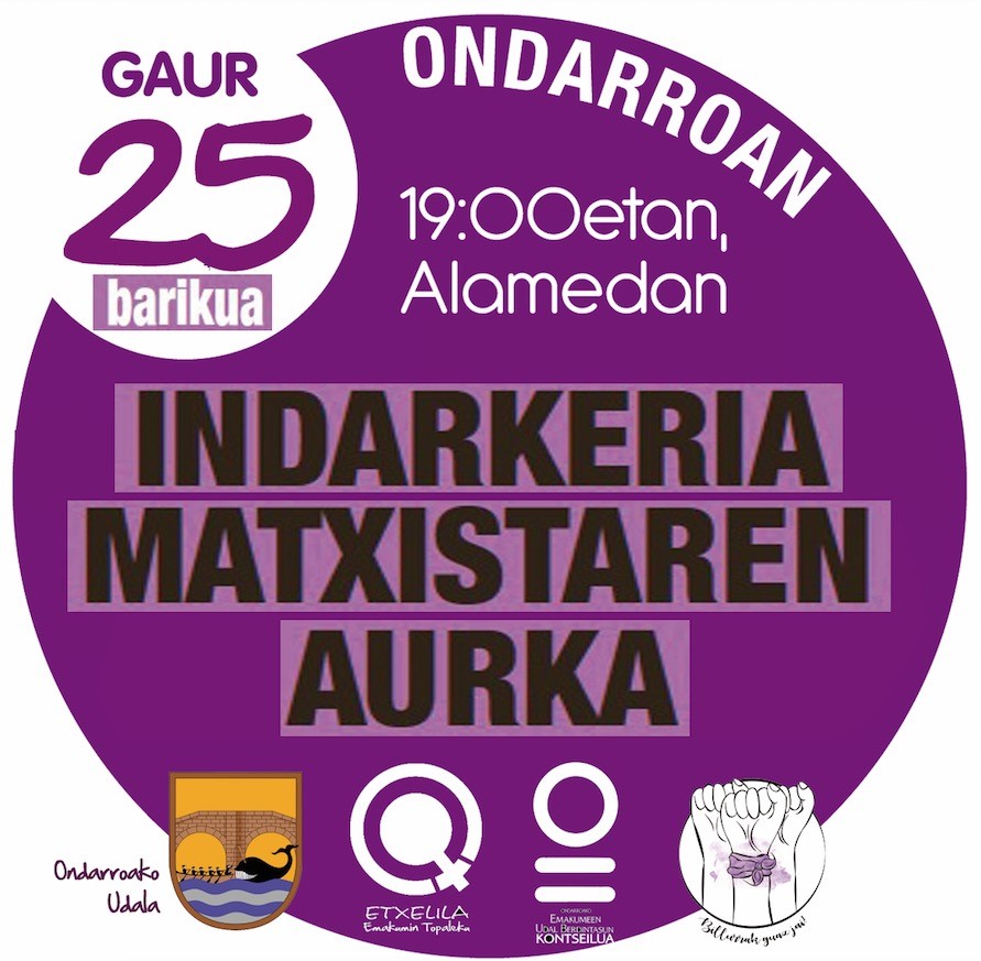Beste behin eta ez dakiau zemat garrenin batuko gaz lelo honeaz, INDARKERIA MATXISTIN KONTRA! Azarun 25 in Alamedan. Kalea urten birdou egunero gertaten dizen giza eskubide urraketak salatzeko. Alamedan ikusiko gaz arratsaldeko 7 retan, etorri zeu be!