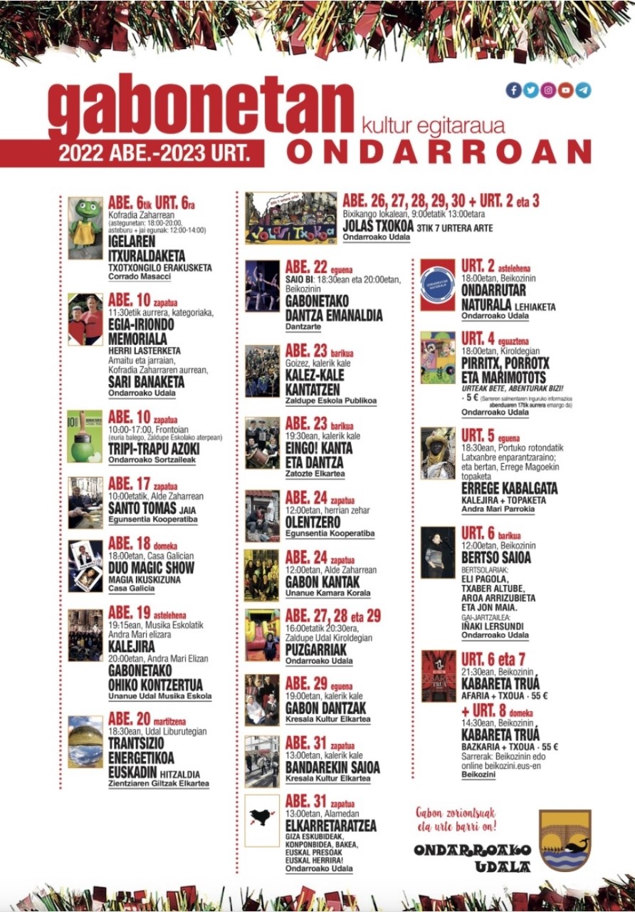 Udalak zabal dau aurtengo gabonetako egitarau (abendua-urtarrilla). Kontzertuk, bertsuk, pallasuk, jolas txoku, dantzaxak….Aurten be ezta ixe!