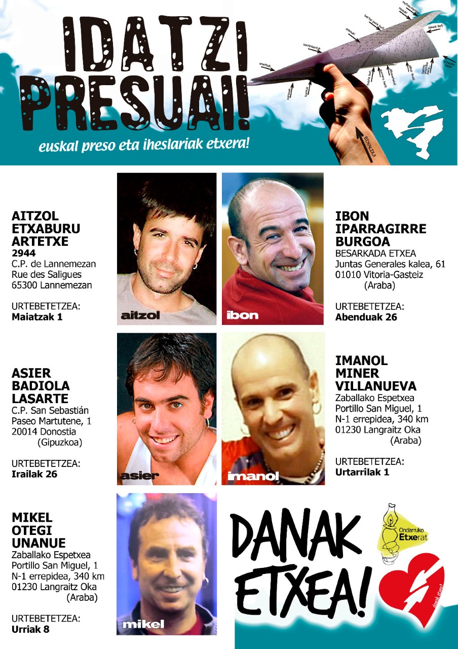 Baixako illuntzin entera giñan Asier Badiola Lasarte, Martutenen dan kartzela alla zala. Beran etxetik 53 kilometroa da gaur egun, pausoz pauso ETXEA hurreatzen. Idatzi presuai atala eguneratu dou eta bertan agertzen diz Ondarrutarran eta Ondarruaz loturi dauken presun “helbidik”. Aitzol ezik, beste guztik Euskal Herriratu dabe aurtengo urtin. Lehen esan douen latxeik, DANAK ETXIN IKUSI ARTE, JO TA KE!