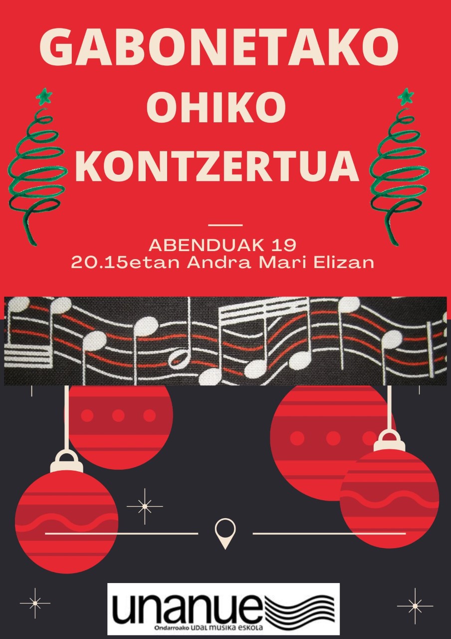 Gabonak hamen daz, horren señaleik garbixena, UNANUE udal musikako ikaslik urtero Andra Mari elixan antolatzen daben musika emanaldixe da. Gogoratu illuntzeko 8:15 tan hasiko dala, hurreatu entzutea!