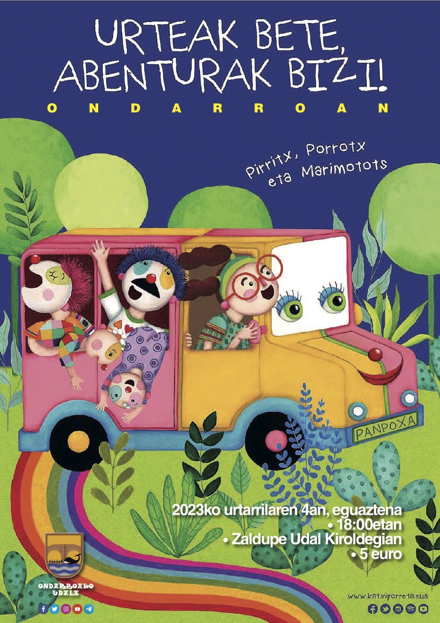 Pirritx Porrotx eta Marimototsen ‘Urteak bete, abenturak bizi’ ikuskizune eongo da Ondarrun urtarrilan 4an, 18:00etan, Zaldupe udal kiroldegixan. Sarrerak, abendun 27tik 29ra egongo diz eskuragarri, Turismo Bulegun, 5 euron trukin, 12:00etatik 14:00eta eta 17:00etatik 19:00eta.