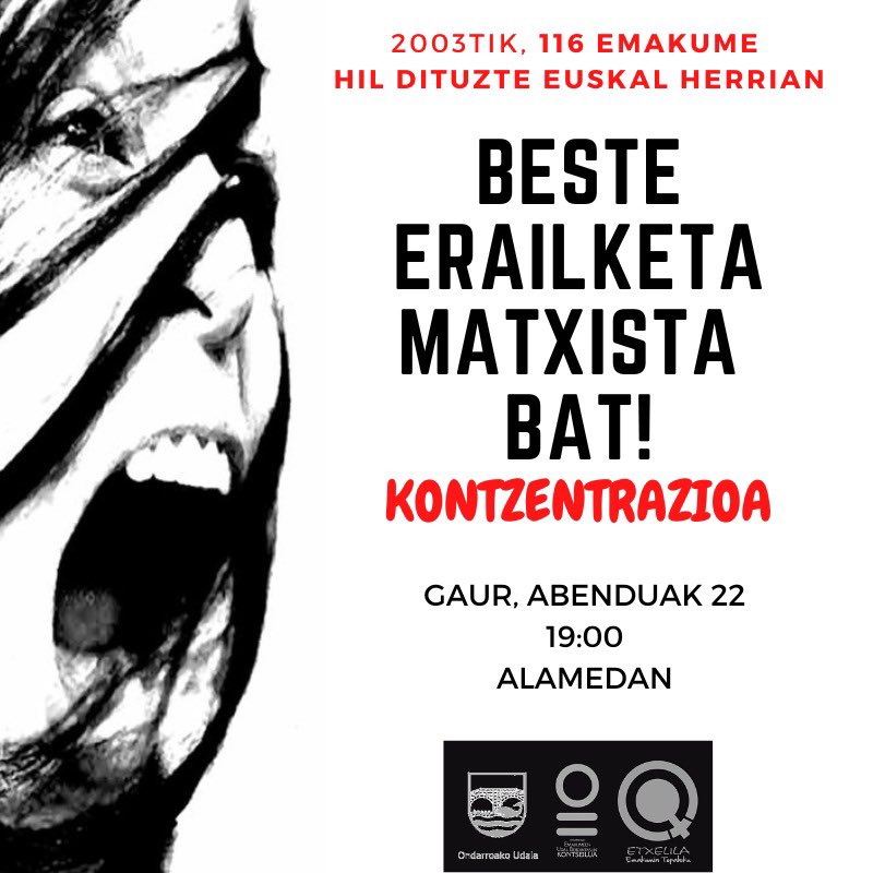 Cortesko (Nafarroa) emakume bat erahil du bere senarrak; Euskal Herrixan aurten indarkeixa matxistik hildako beste emakume bat. Hori salatzeko, elkarretaratzea deitxu dau Ondarruko Udalak, gaur, 19:00etan Alamedan. NAHIKURE!