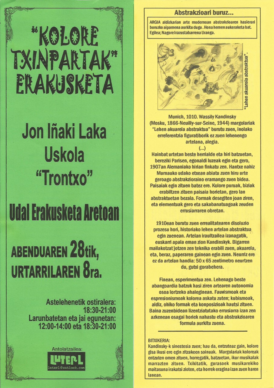 Aurrera argitaratu gendun latxeik, KOLORE TXINPARTAK erakusketi da zabalik Udal erakusketa aretun. Gu bertan eonga ta harritxute geatu gaz pintxuran kolorin bixitxasunakin, Merezi dau buelta bat emoti erakusketa aretutik.