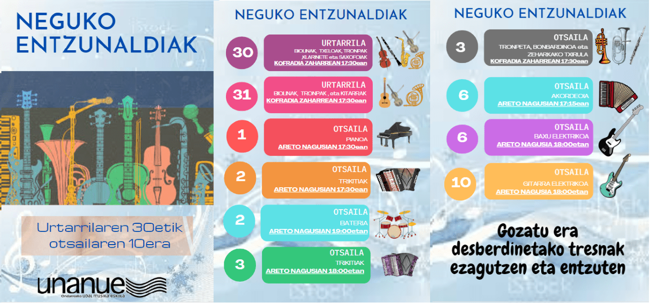 Gogoratu hurrengo astelehenin hasitxe eta Otsailan 10 earte Neguko Entzunaldixak eukiko douela Unanue udal musikako areto nagusixan eta kofradi zaharreko 2. pisuko aretun . Hurreatu entzutea!