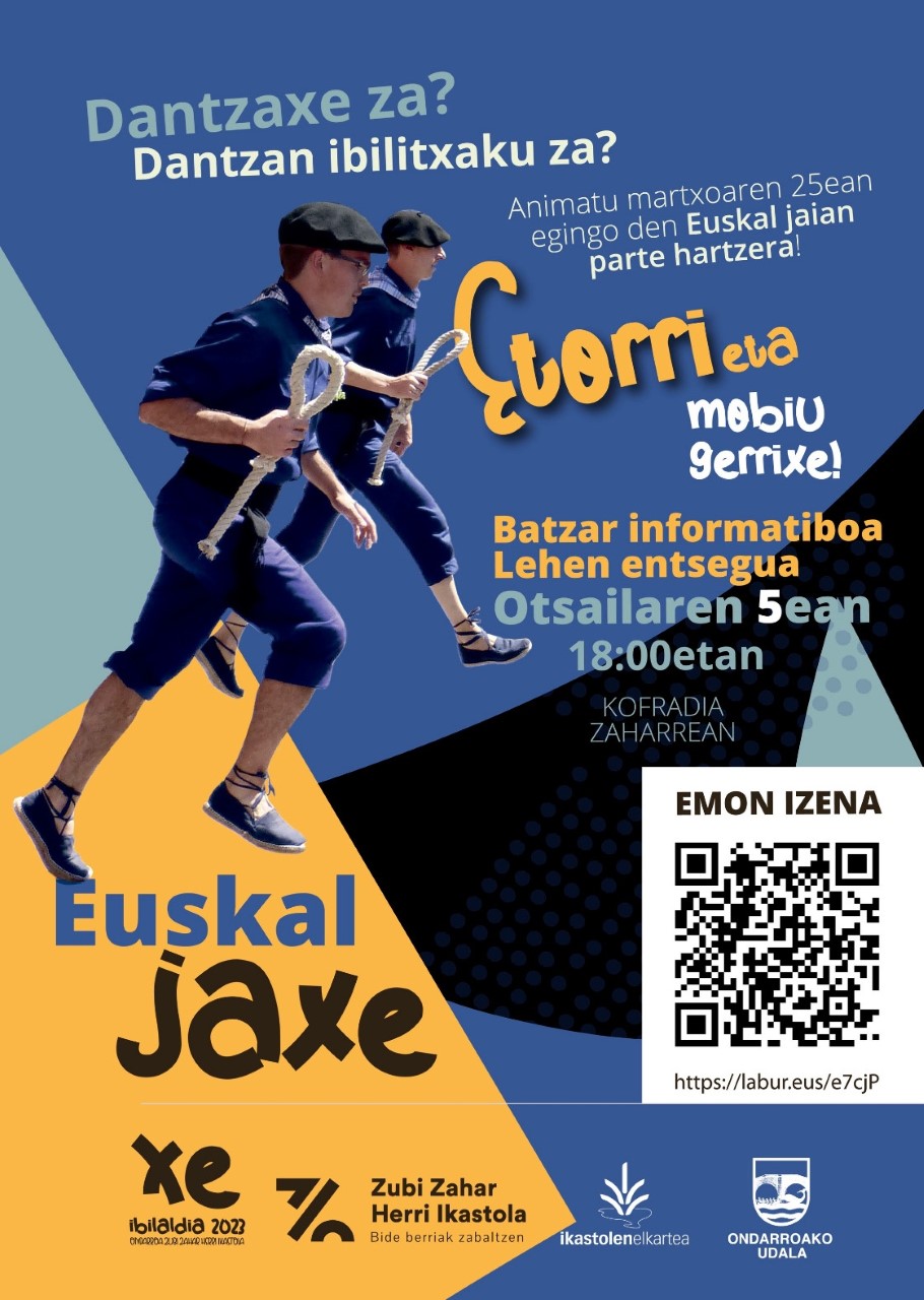 Otsaillak 5 (domeki) kofrai zaharrin arratsaldeko 6 retan batzar informatibu + lelengoko entsaxu prestatu dabe, herrixan antolatu nahi dan EUSKAL JAXAN parte hartzeko. Dantzaxe za? edo dantzan ibilitxaku? Etorri eta gerrixe mobiu! Denpori eukikozu eguneratzeko, EUSKAL JAXE Martxoak 25 in ixango da.