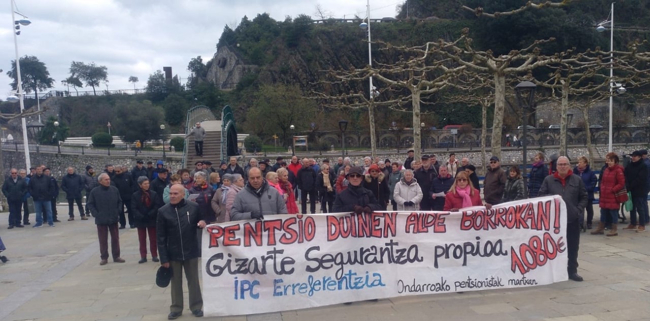 Alamedako PENTSIONISTAK beste behin be batu diz gaur eguerdixan pankarta atzin PENTSIÑOI DUIÑAK eta GIZARTE SEGURANTZA PROPIXU eskatzen. Gaur 135 lagun batu diz antolatzallin esanetan eta astik emon daben barrixak atxik berba eindabe (gitxieneko PENTSIÑOI 1080 euro eskatzeko, entzerroni antolatuko dabe Bilbon, Martxoan 18 xan manifa nazionala Bilbon…) Datorren astelehenin be bertan eongo eidiz esanaz amatxu dabe gaurku. Jo ta Ke LORTU ARTE!