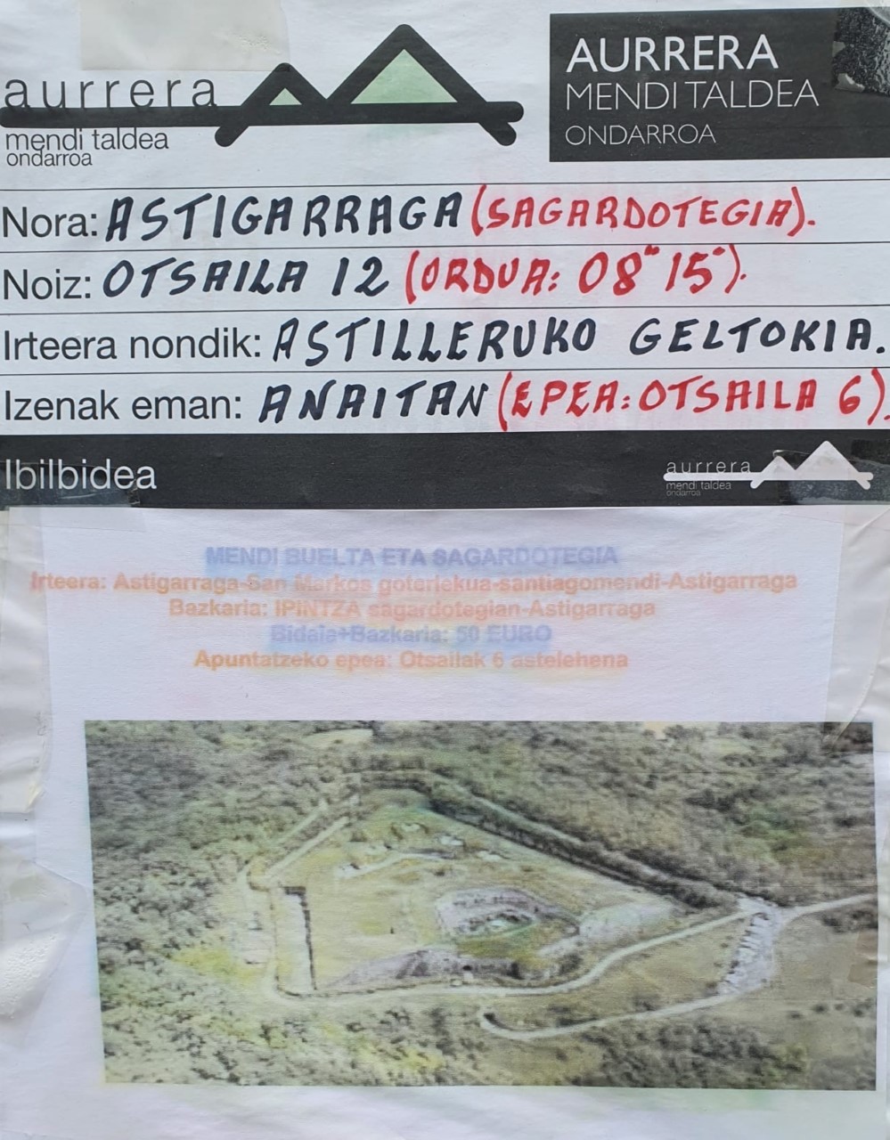 Ederra plana antolatuzku AURRERA MENDI TALDIk Otsailak 12 rako. Lelengo ta behin mendi buelta ederra, ASTIGARRAGA-SAN MARKOS GOTORLEKU-SANTIAGOMENDI-ASTIGARRAGA, ta gero IPINTZA sagardotegire bazkaltzea, dana 50 euron trukin. Ixena emoteko azkan egune Otsailak 6 (astelehena) eta betiko tokixan apunta, ANAITASUNA tabernan. Jantzi mendiko botak eta egurre aldapan gora!