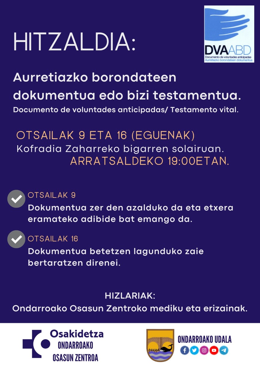 Aurretiazko borondateen dokumentua edo bizi testamentuaren inguruko hitzaldia antolatu dute Ondarroako Osasun Zentroak eta udalak. Otsailak 9 eta 16, eguenak, 19:00etan Kofradia Zaharrean.