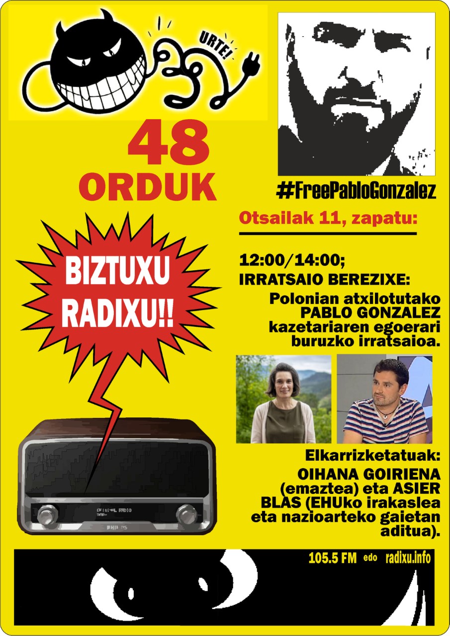 RADIXU irratixan 48 ordu jarraixin barrun irratsaio berezi bat antolatu dabe PABLIO GONZALEZ kazetarixan ingurun. PABLO GONZALEZ kazetari euskaldun bat da eta Polonian da atxilotute jakingo dozuen latxeik (Rusun aldeko espii dala akusaziñoipin). Asko ixan diz beran askatasune aldarrikatu daben lagunak, bai kazetaritza mundun, bai politika mundun, bai instituziñoik, eta zelan ez komunikabidik, hor sartzen da RADIXU irratixe. RADIXUk beran babes osu eskeintzen dotza, bai berai bai etxekuai, pasaten dazen egoera gogorratxik.