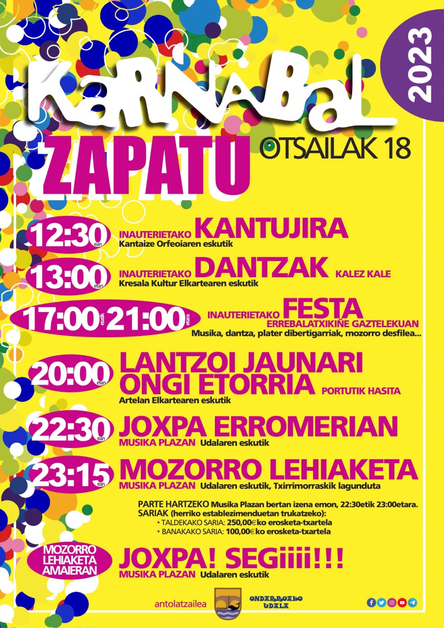 Hamen dakazue aurtengo karnabaletako udal egitarau, beti lez bete beti! Ez diz faltako Kantujiri, playbacka, kalez kaleko dantzak, erromeixi…Onezkeo mozorroren bat prest dakazue, guk bai!