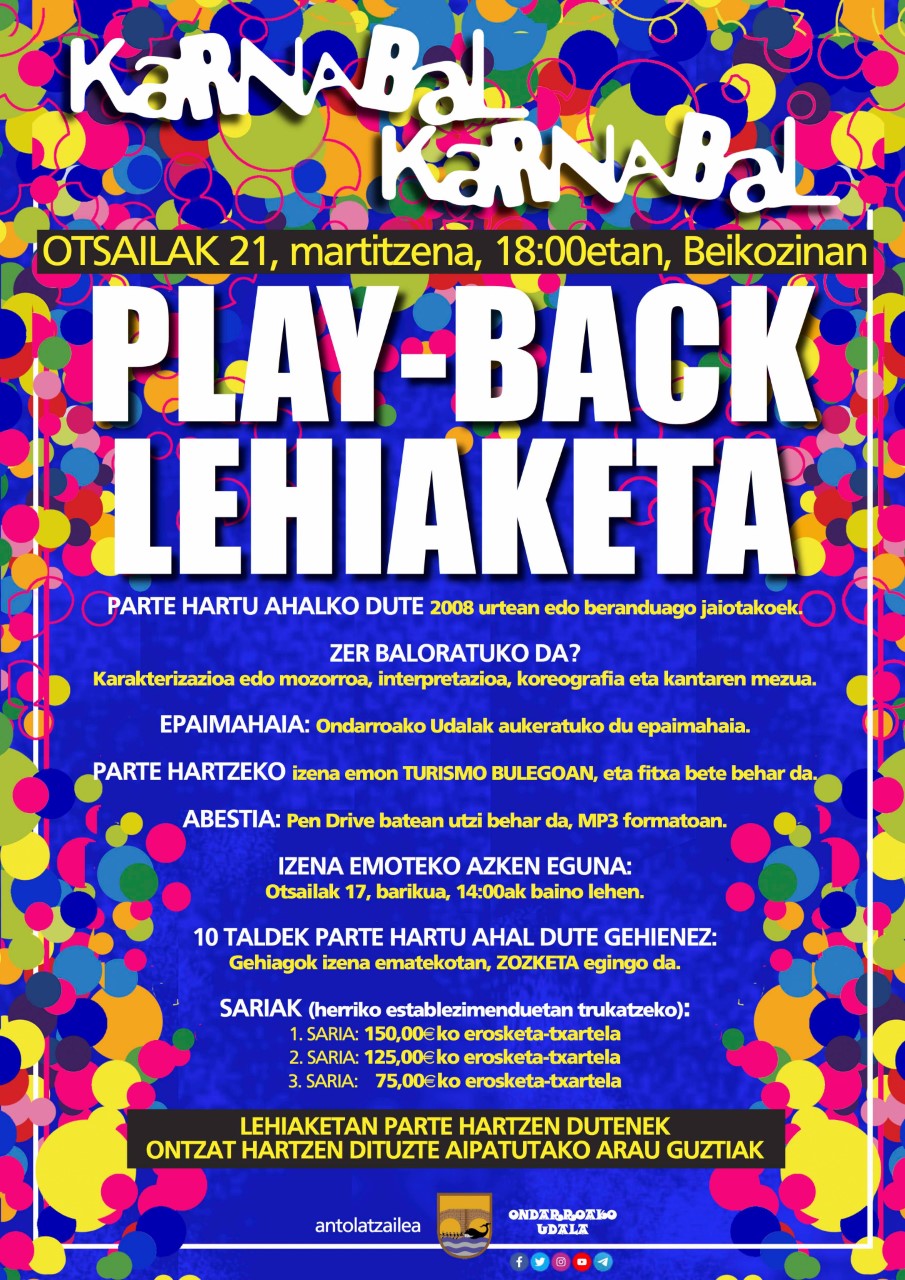 Gogoratu Playbackin parte hartezeko ixena emon birdozuela eta epi otsailak 17 xan amaitxen dala. Azpixan dakazue bertan parte hartzeko oiñarrixak. Umoreik ez datxile falta, lotsi etxin laga ta ata kalea zeure barruku!