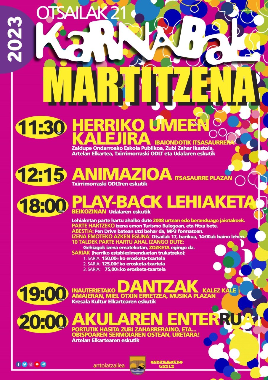 Herriko ikastetxik mozorrotute kalea urteteko egune bihurtu de egun hau, umikin batea gurasuk, noski. Aspaldi baten suerte txarra dan eukitxen egune dala esan birdou, eguraldixe dala ta, ia ongun hori aldatzen dan eta denpori geure alde dan. Azpixan ikusiko dozuen kartelin ikusiko dozuez egunin tzir egongo dizen ekitaldixak. Ia ondo pasten douen danok, mozorroz jantzirik.