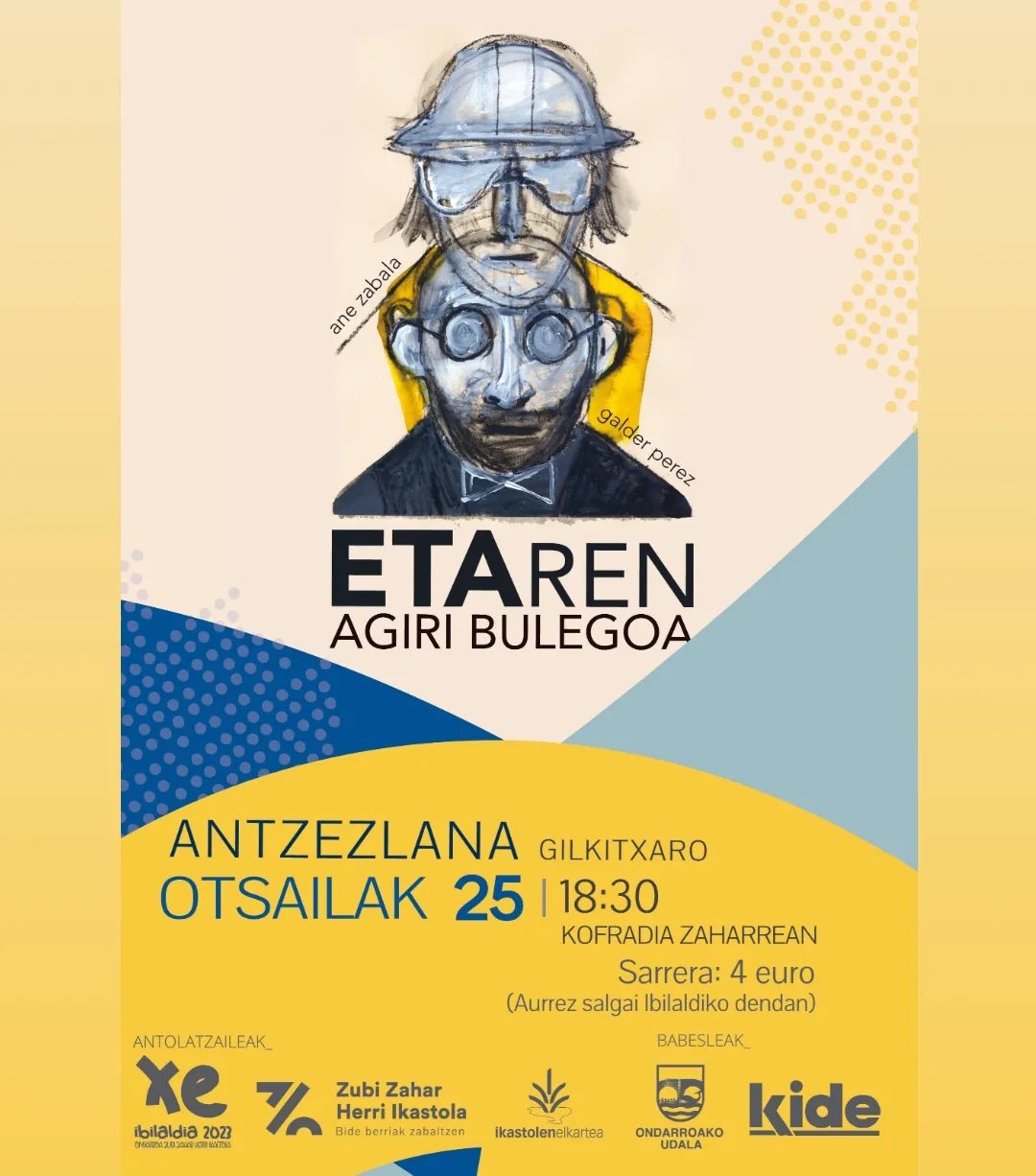 Gorde egun hau, Otsailak 25 (zapatu), Kofrai Zaharrin arratsaldeko 6:30 xetan antzezlana ikusteko aukeri eukikou. ETAren agiri bulegoa, ixenburuaz. ANE ZABALA ta GALDER PEREZek antzeztuko dabe. Berta juteko sarrerak 4 euron trukin ahalko diz lortu Ibilaldiko dendan (Saninazio kalin).