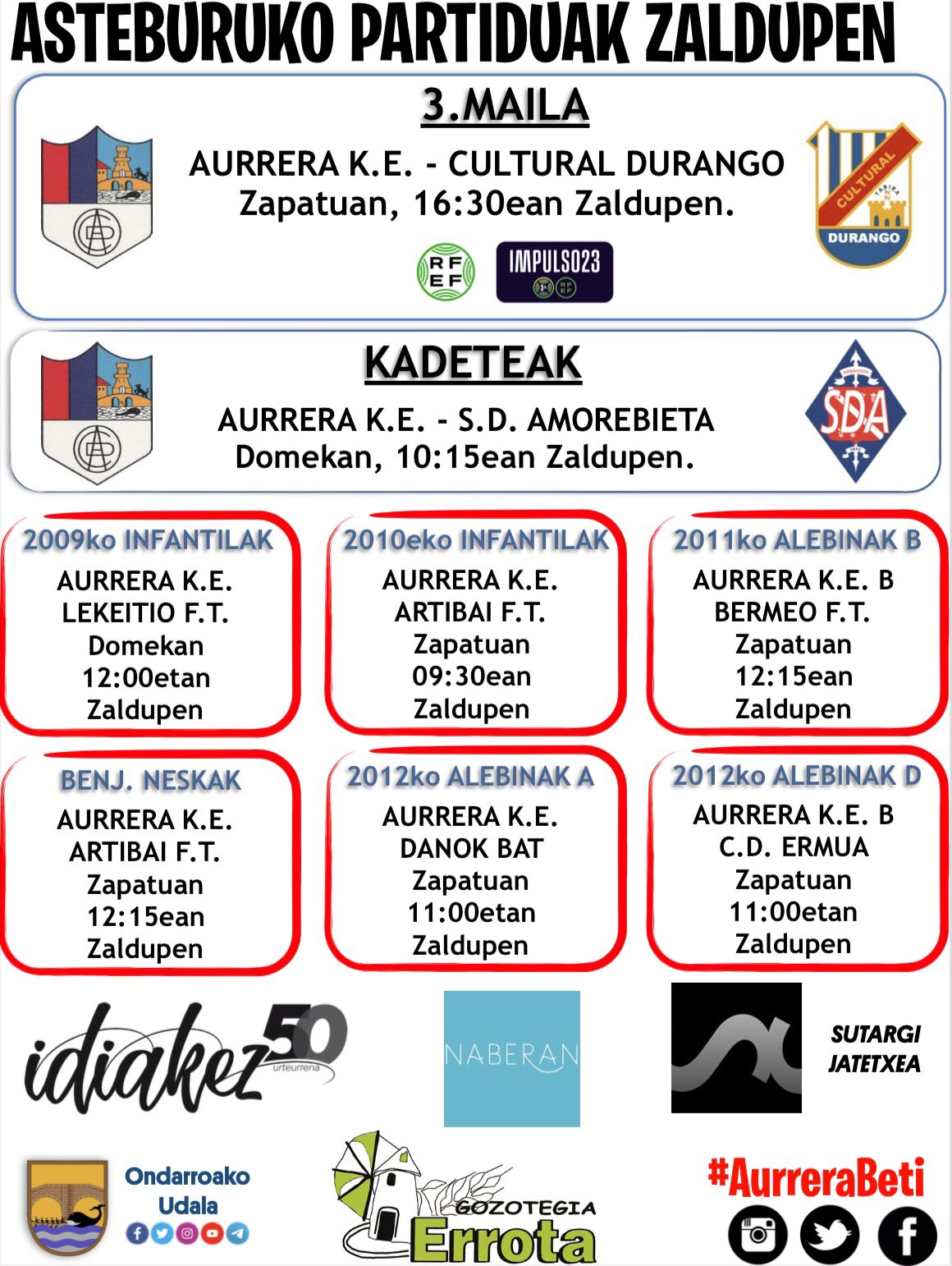 Honek diz asteburo honetan Zaldupe udal futbol zelaxan AURRERAko talde desberdiñak jokatuko dotxuen partidun egun eta ordutegixak. Guazen Zaldupea geure taldik animatea, Aupa AURRERA tra ka tra!