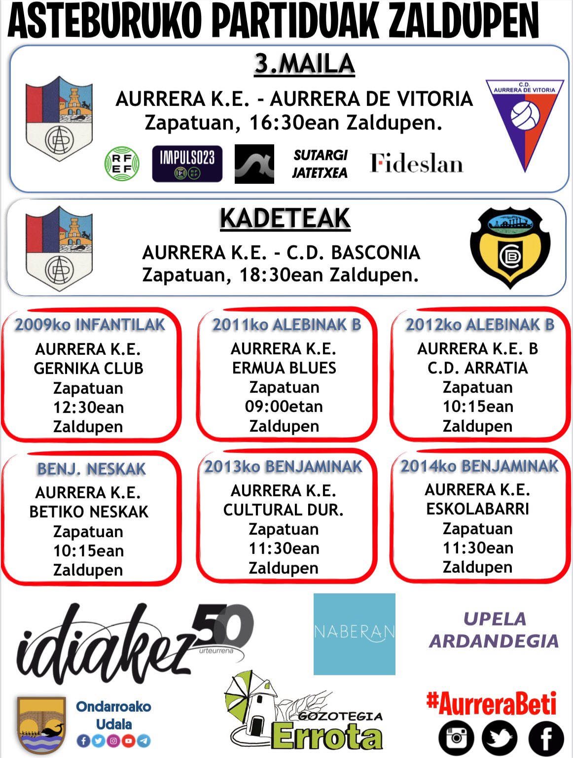 Honek diz asteburo honetan Zaldupe udal futbol zelaxan AURRERAko talde desbardiñak jokatuko dotxuen partidun egun eta ordutegixak.