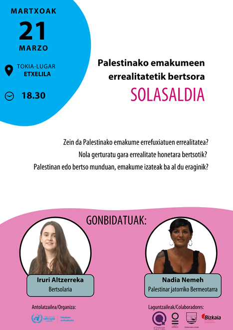 Solasaldi honetan Palestinako emakume errefuxiatun testuingurure hurreatuko gaz. Era berin, errealitate honeta bertsotik zelan gerturatu gazen elkarbanatuko dou bertaratutakukin. Gogoratu Etxelilan arratsaldeko 6:30 tan hasiko dala ekimena. Hurreatu entzutea!