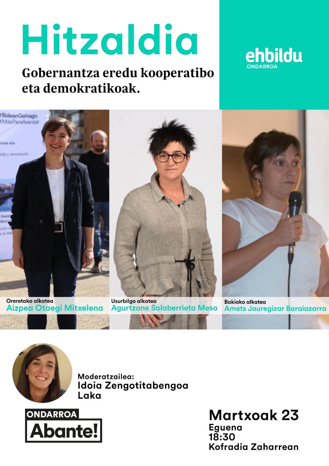 Gobernantza eredu kooperatibo eta demokratikun ingurun solasin eukiko douz Aizpea Otaegi Mitxelena (Oreretako alkati), Agurtzane Solaberrieta Mesa (Usurbilko alkati) eta Amets Jauregizar Baraiazarra (Bakixoko alkati).