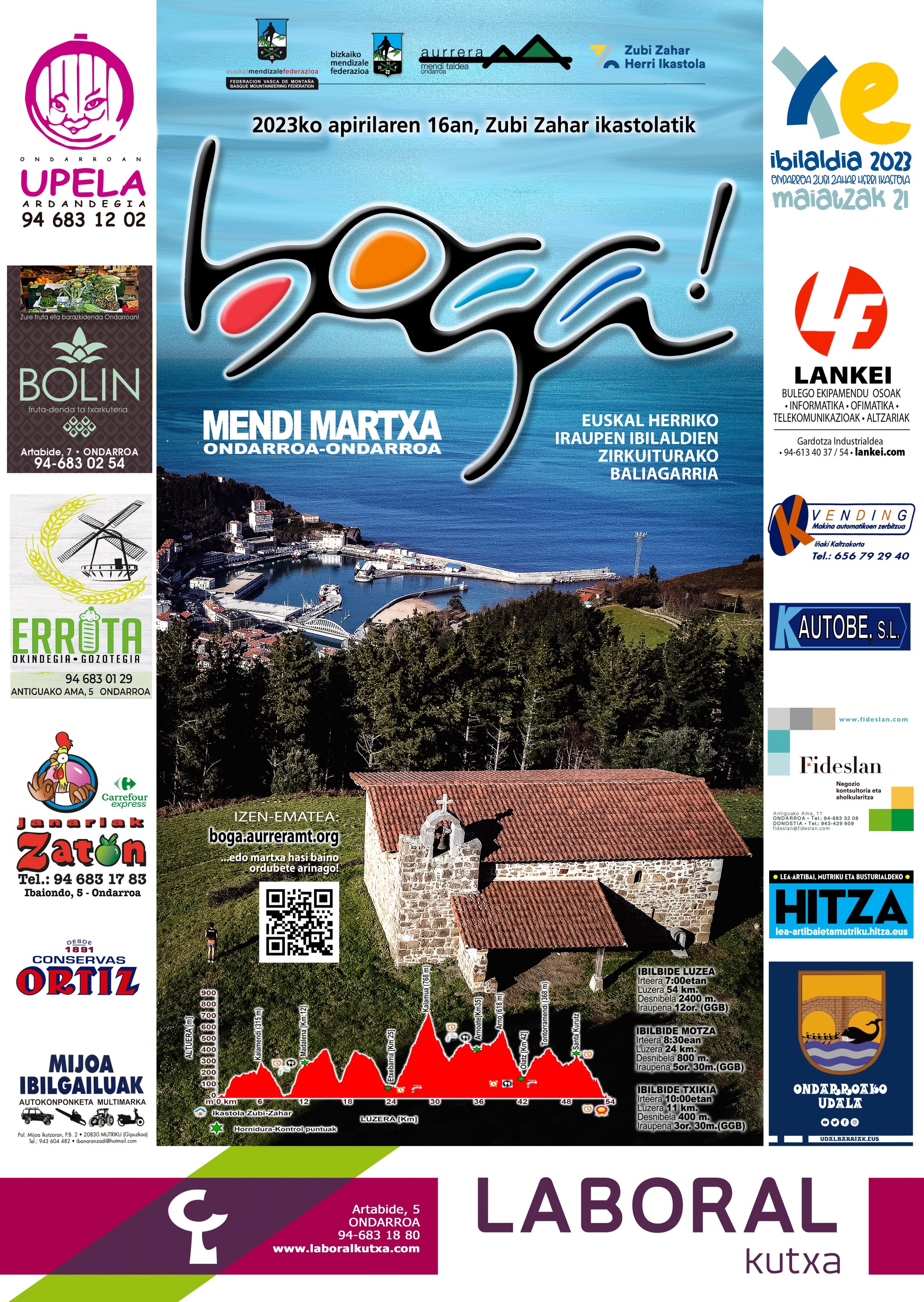 Boga mendi martxi, Ondarruko Zubi Zahar herri Ikastolik (Aurrera Mendi Taldin laguntziaz) antolatutako mendi irteeri de. Berau, Apirilan 16an ixango da eta bi ibilbide desberdin eukiko dau adin zein forma fisiko desberdinak dauken jendik parte hartu daitxin.